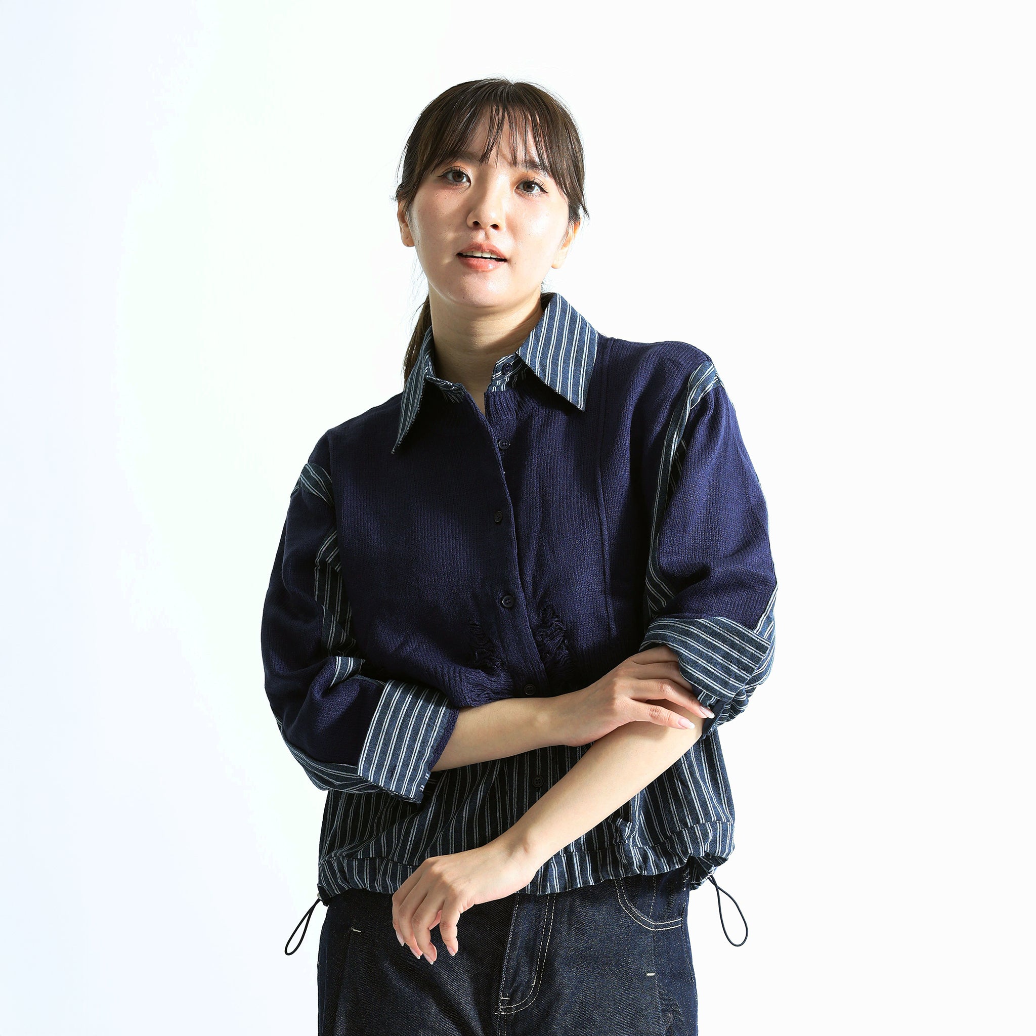 【感性を纏う】デニム×ストライプシャツ 異素材ドッキング リメイク風トップス