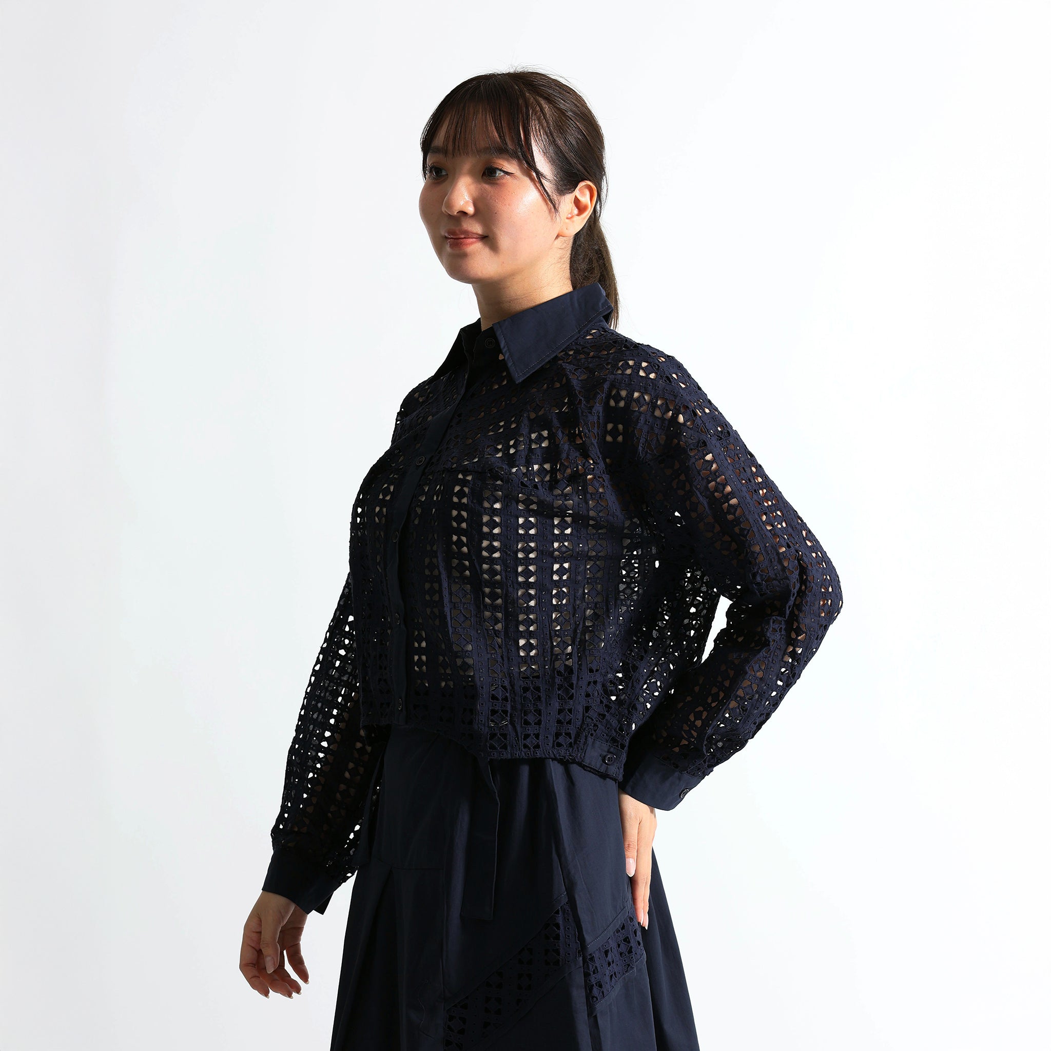 美シルエット Vラインレース切替 バンドカラー 裾ドロストトップス