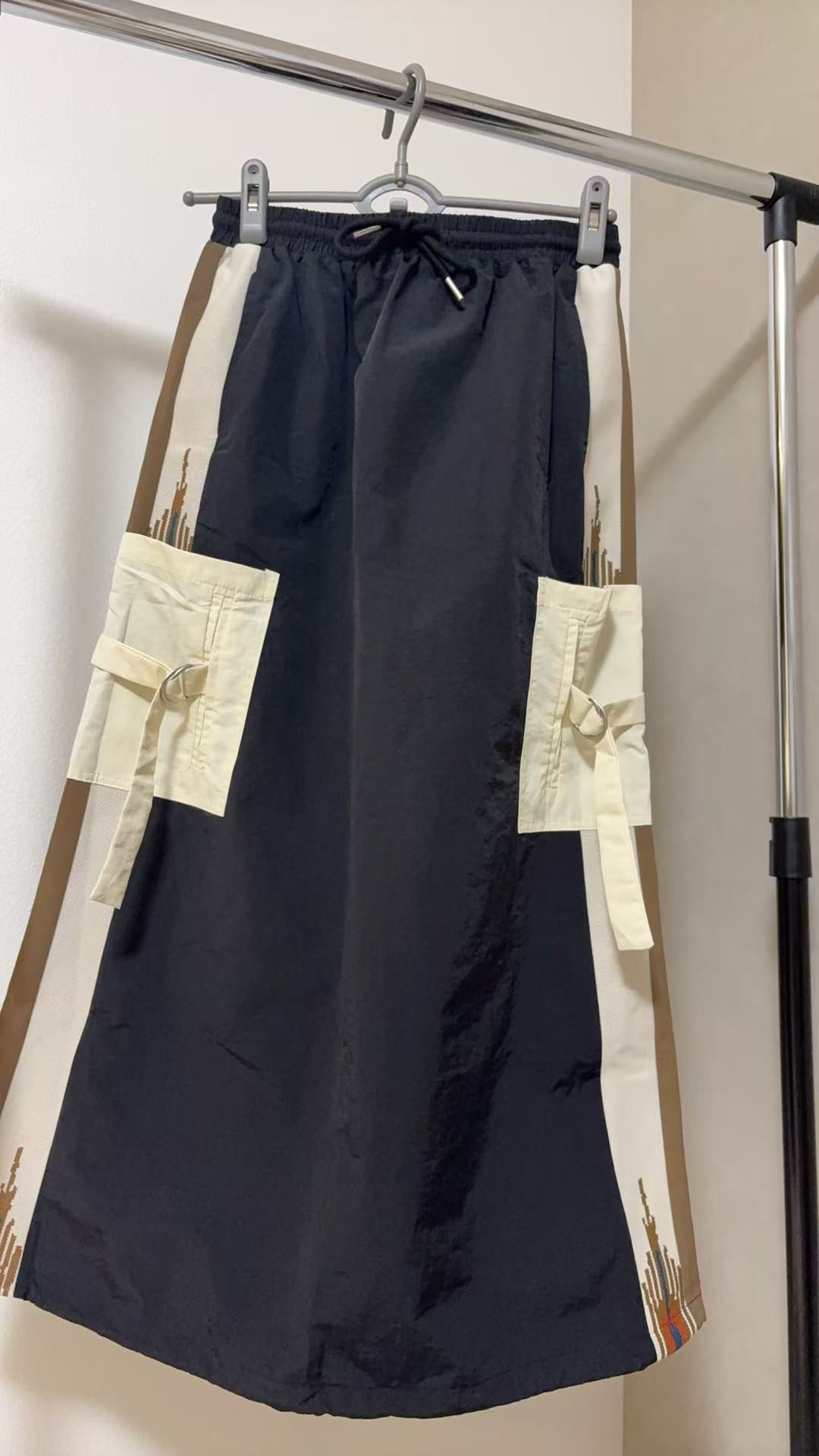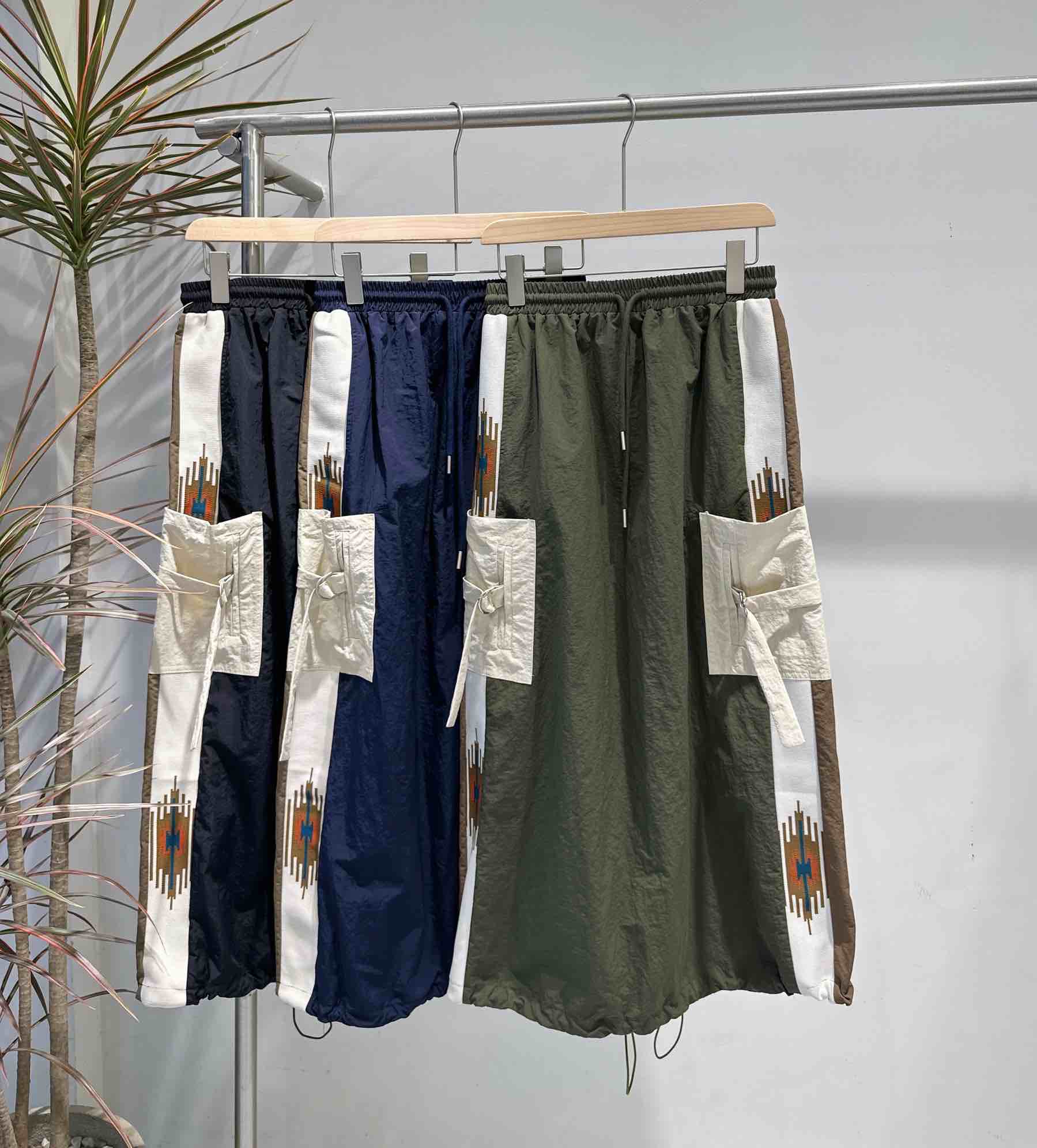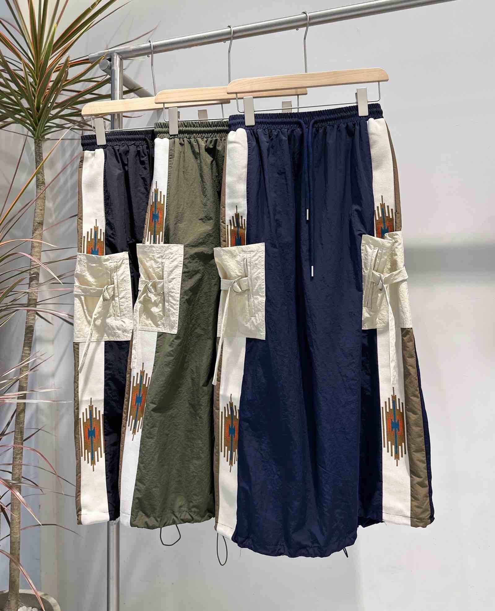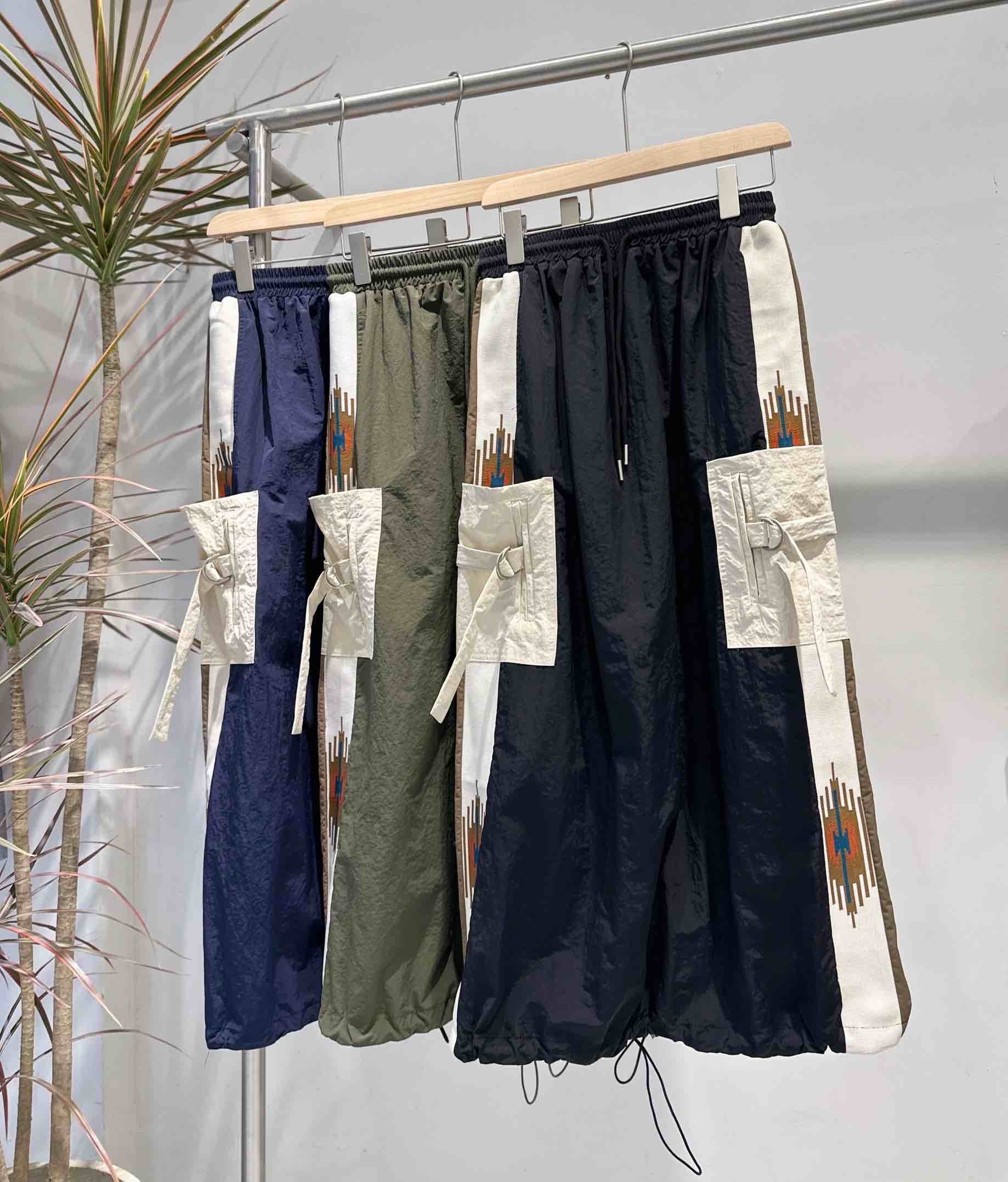 デザイン:両脚部分に施された大きなカーゴポケットと、サイドのネイティブ柄のラインが特徴です。ウエストは紐で調節可能です。