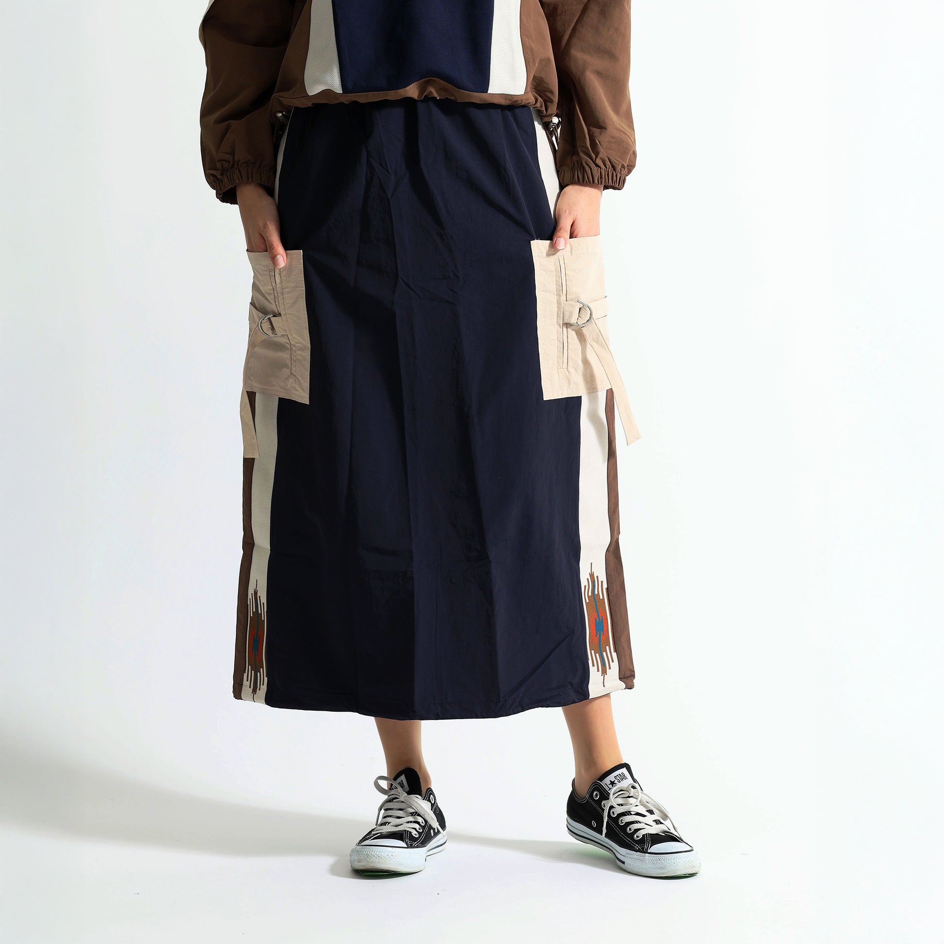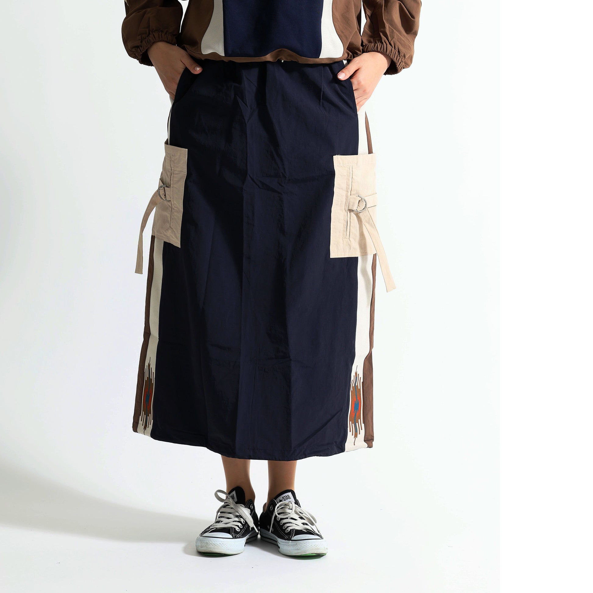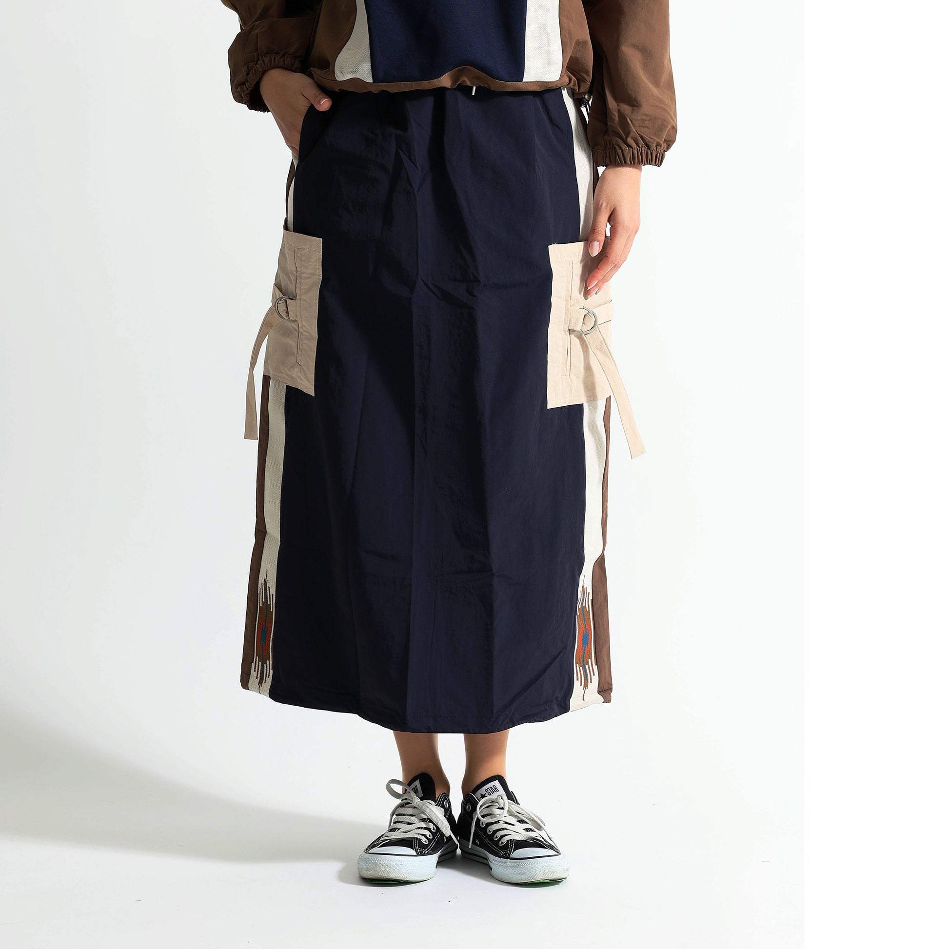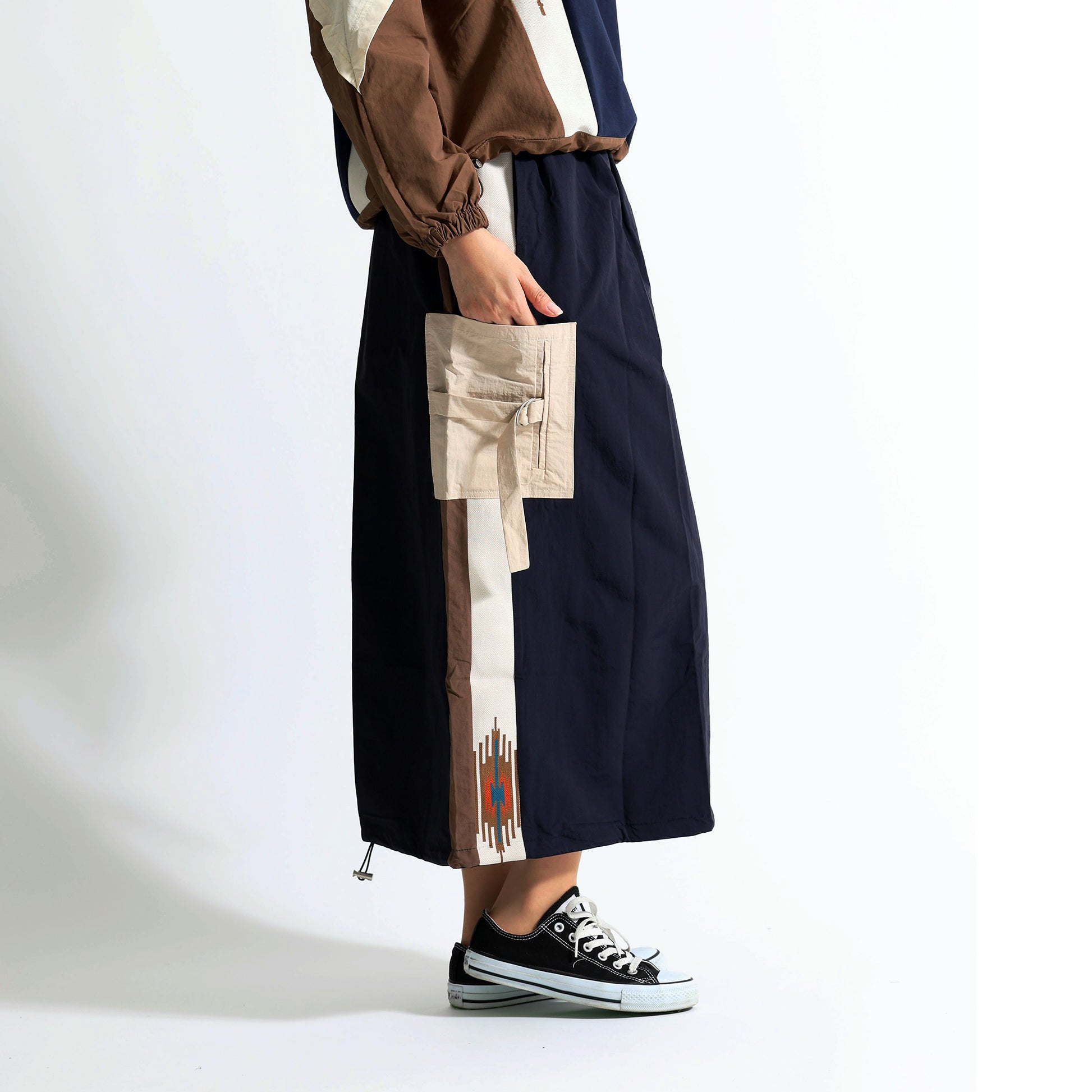デザイン:両脚部分に施された大きなカーゴポケットと、サイドのネイティブ柄のラインが特徴です。ウエストは紐で調節可能です。