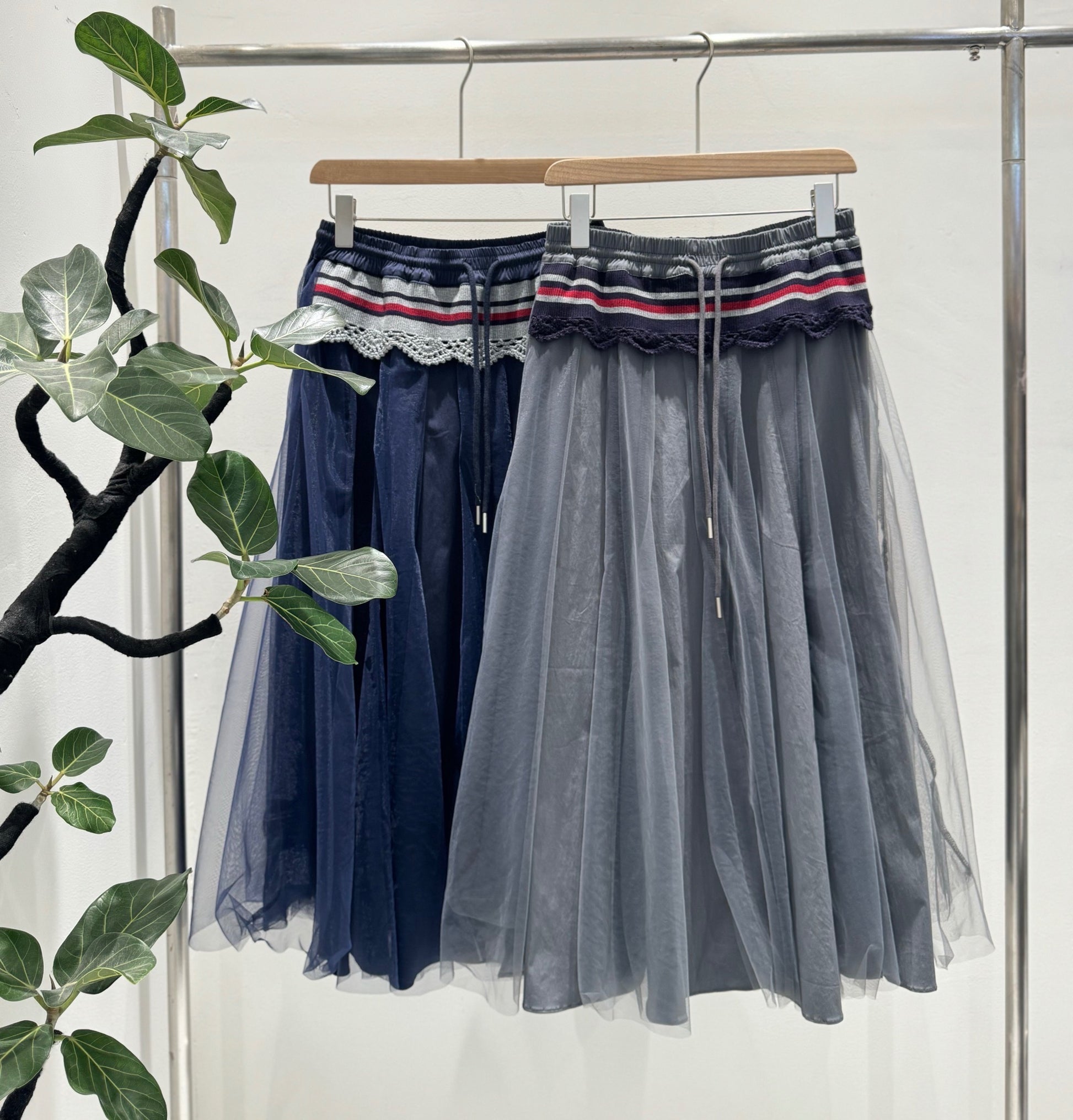 ウエスト部分にラインとレースディテールをあしらった、性の高いチュールスカート。