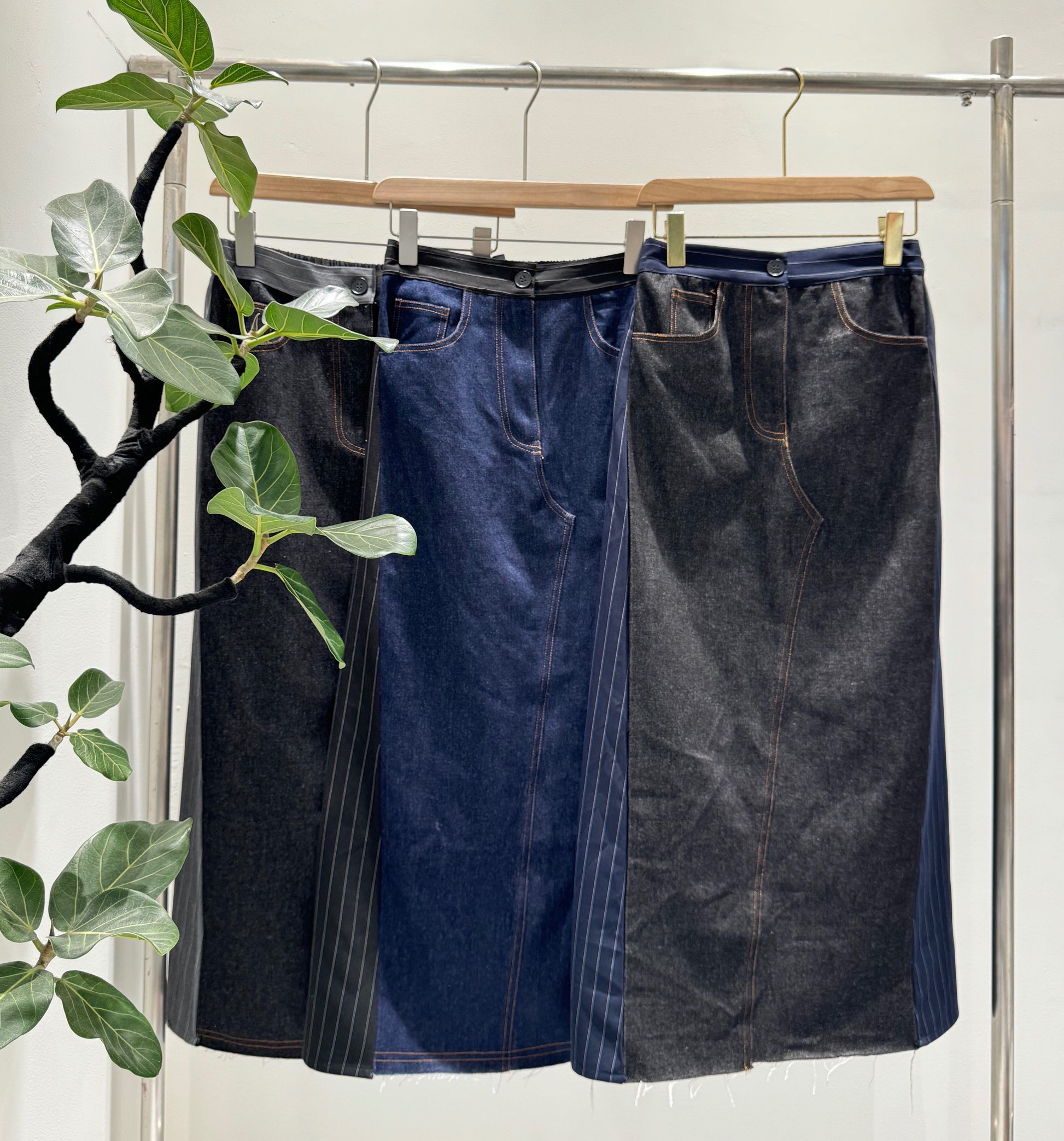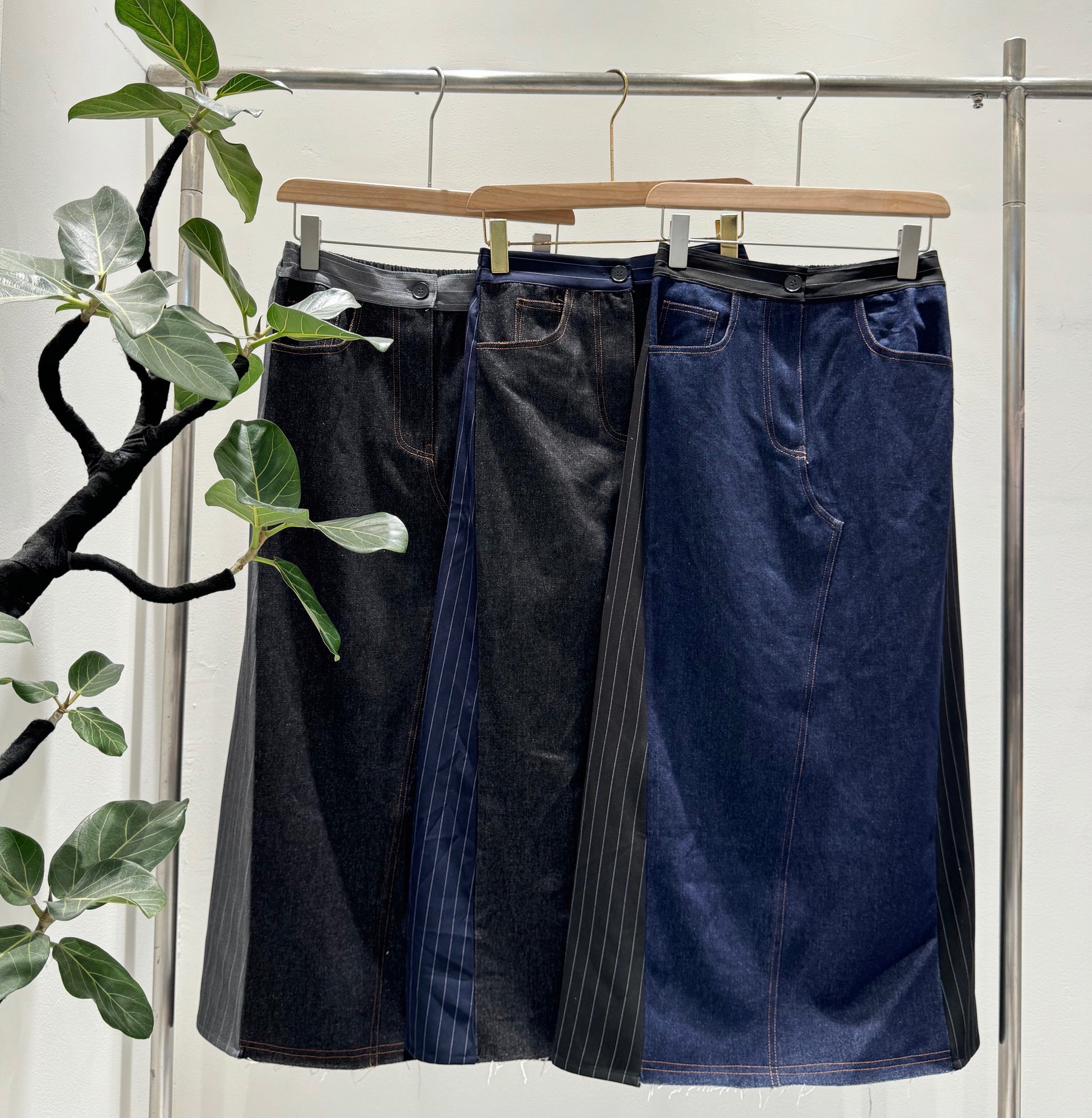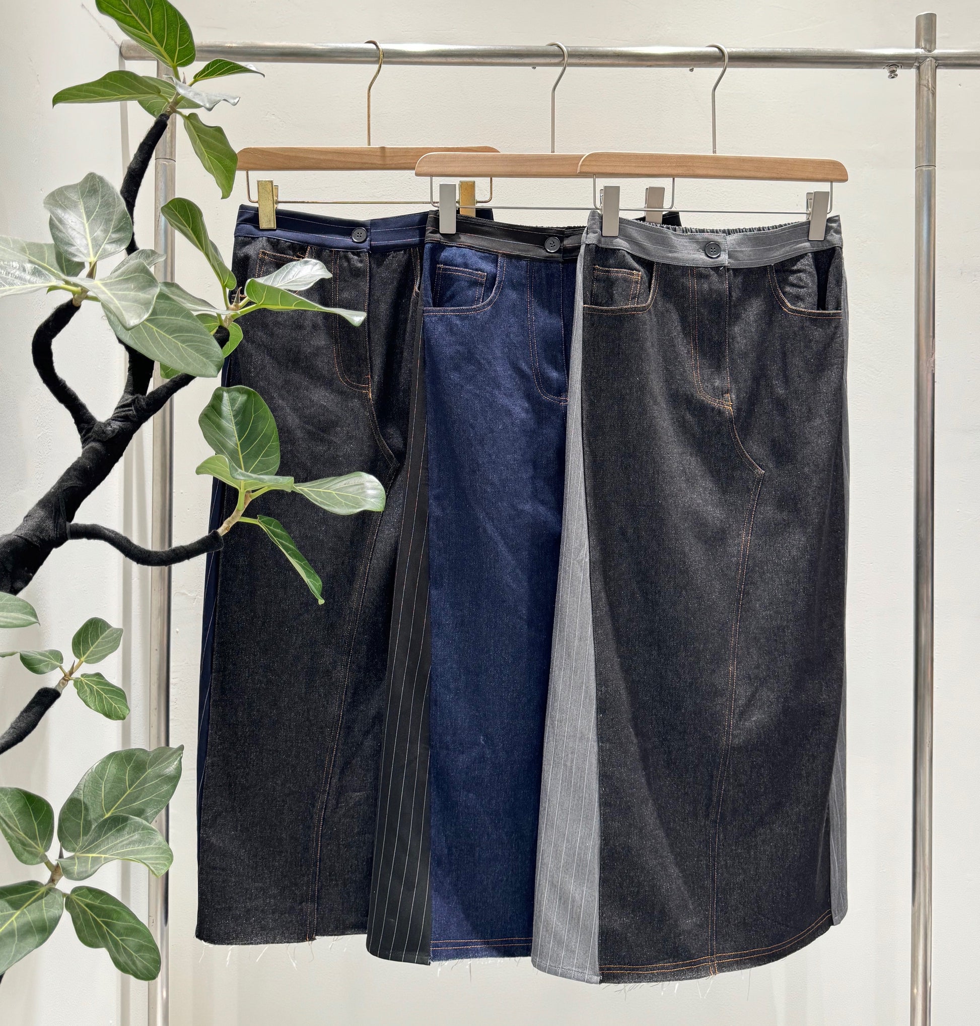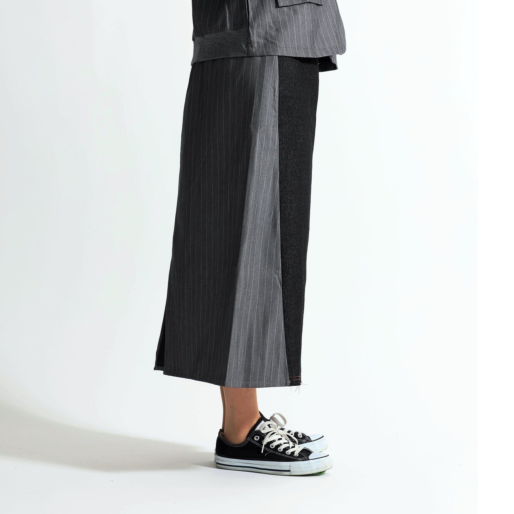 デニムのカジュアルさと、テーラリングの気品が集まる一着王道のデニムロングスカートに、スーツライクなピン生地をサイドパネルとしてドッキングさせた、ハイブリッドなデザインストライプスカートです。