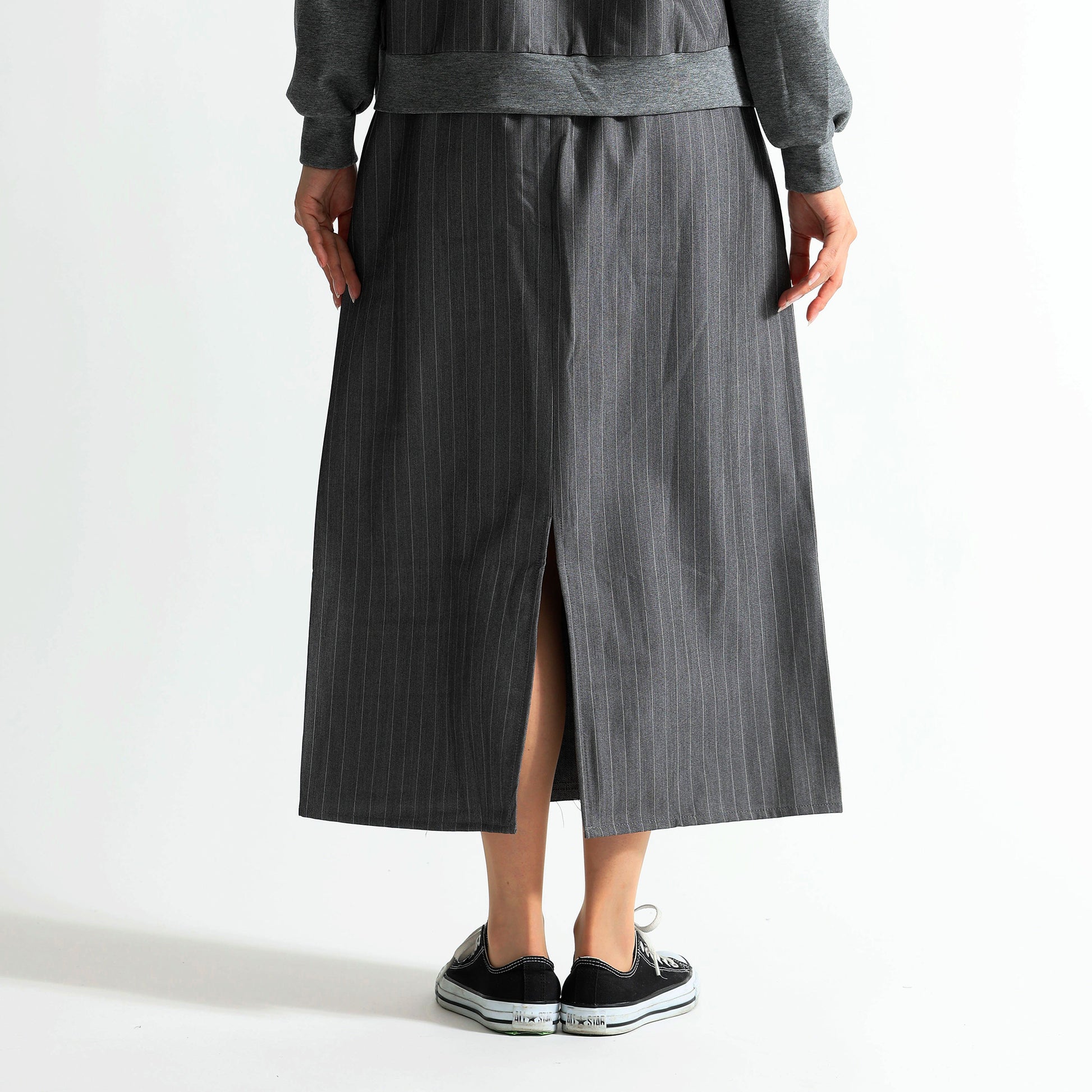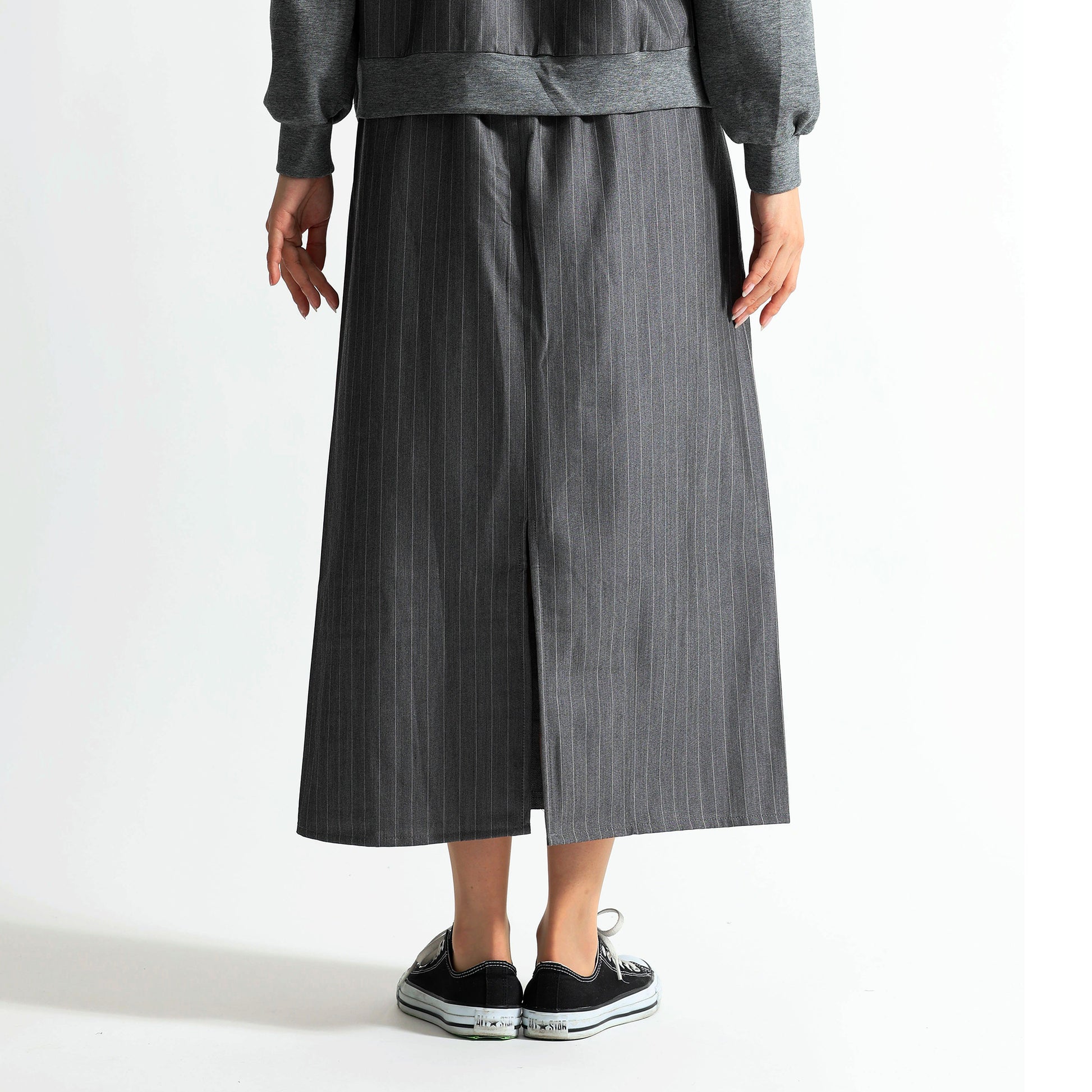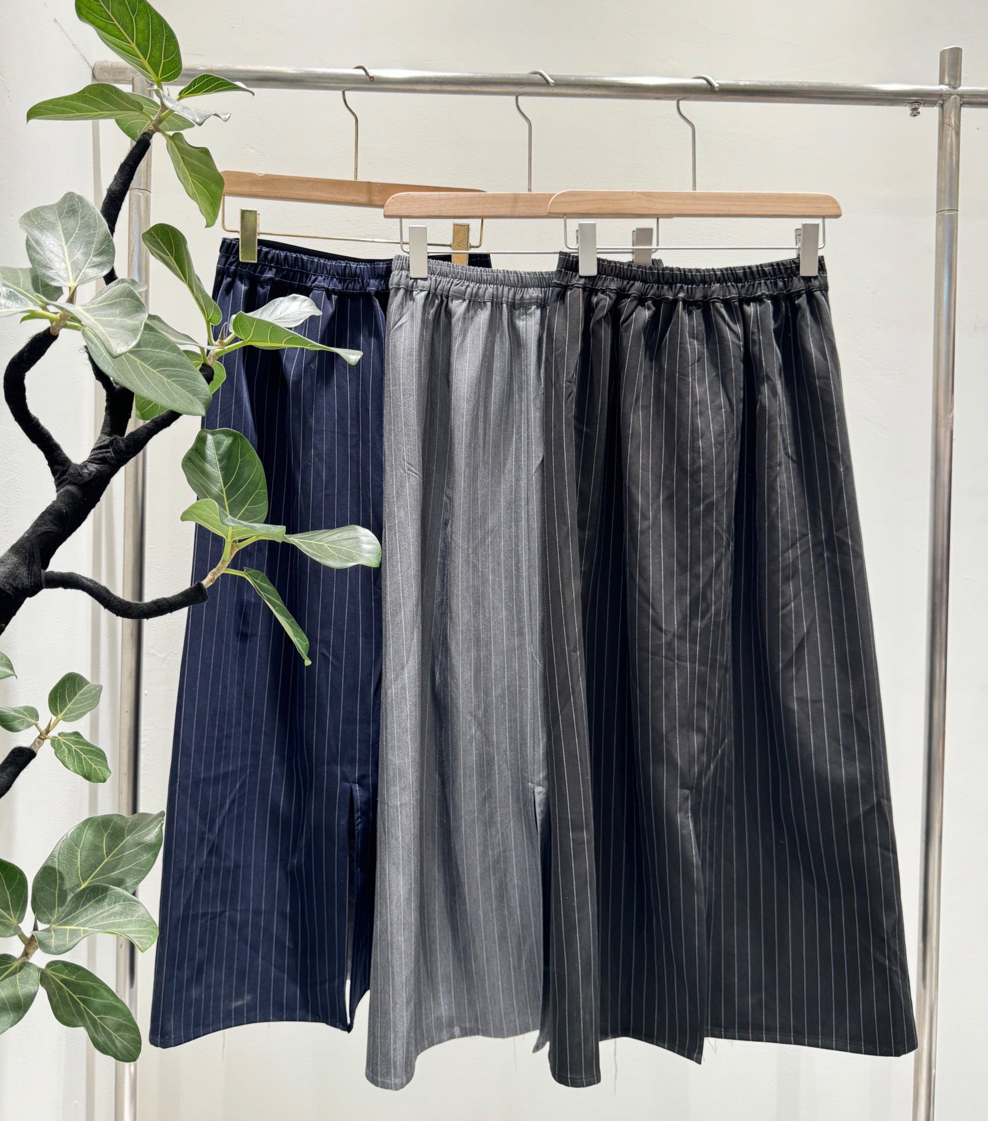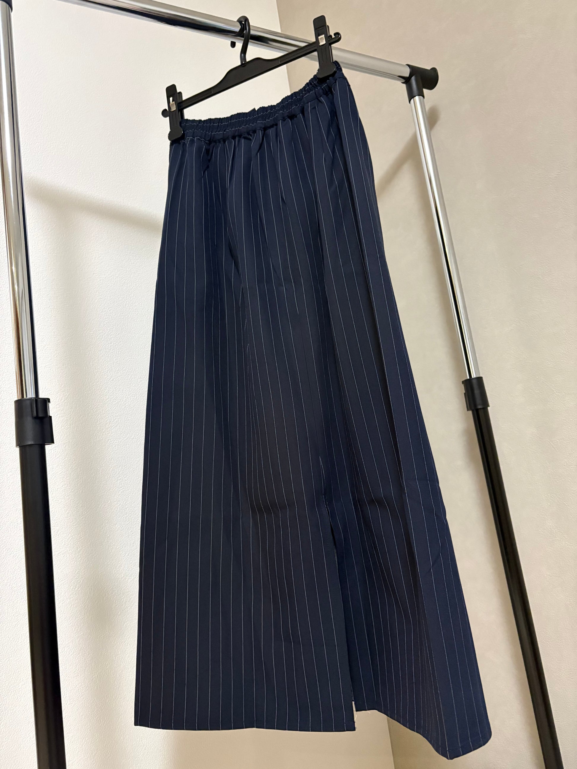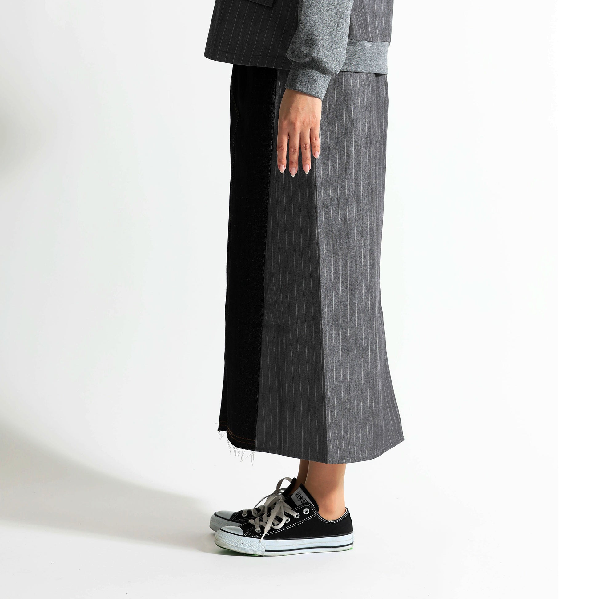 デニムのカジュアルさと、テーラリングの気品が集まる一着王道のデニムロングスカートに、スーツライクなピン生地をサイドパネルとしてドッキングさせた、ハイブリッドなデザインストライプスカートです。