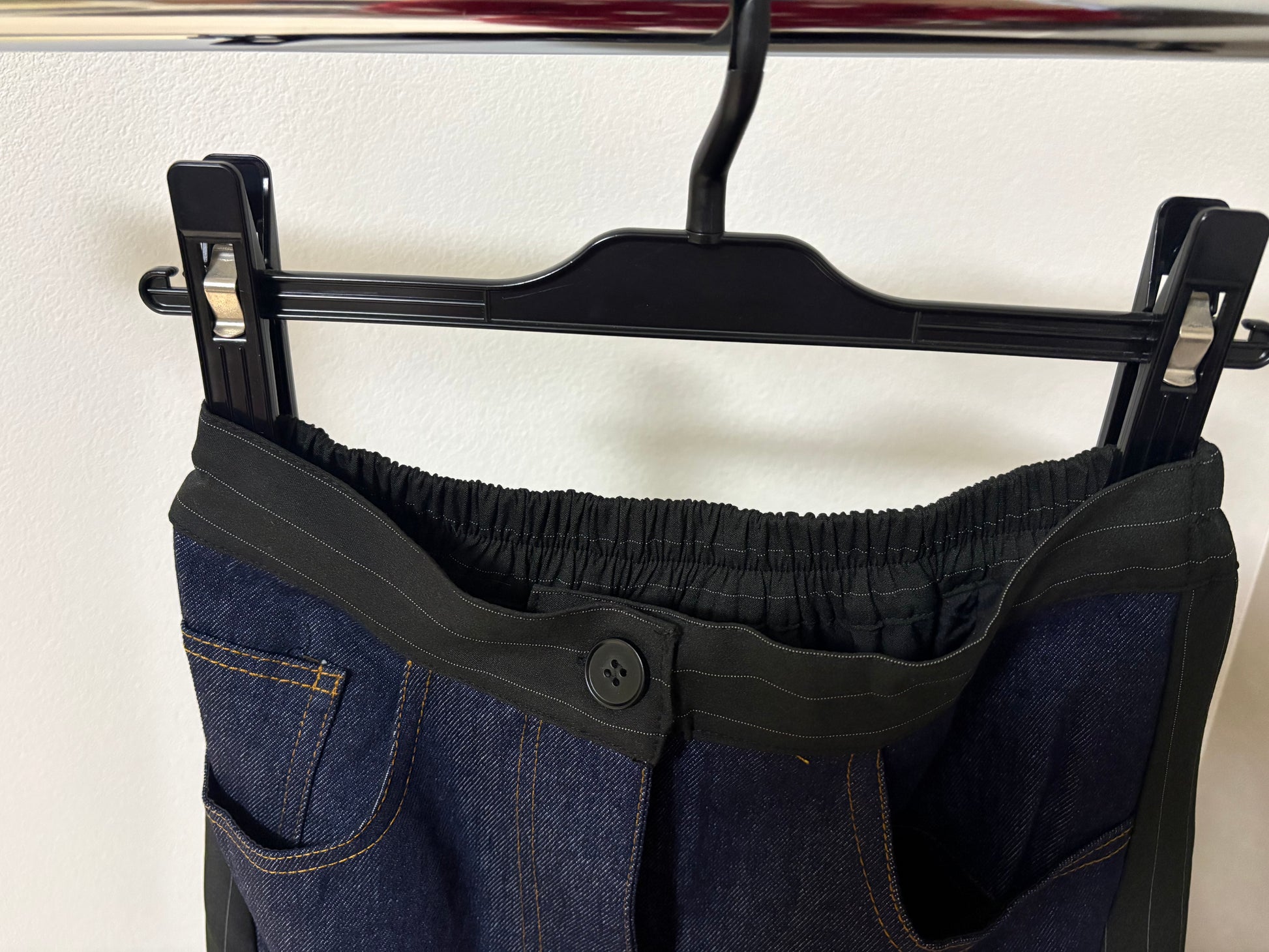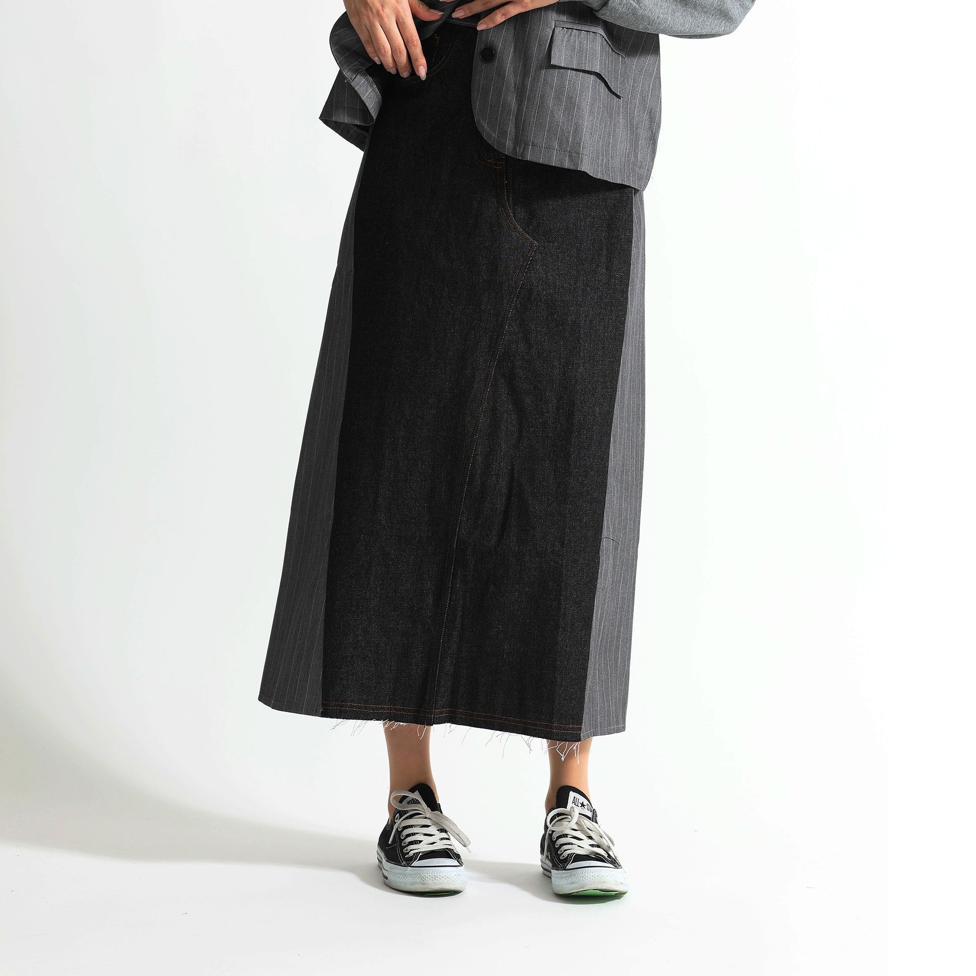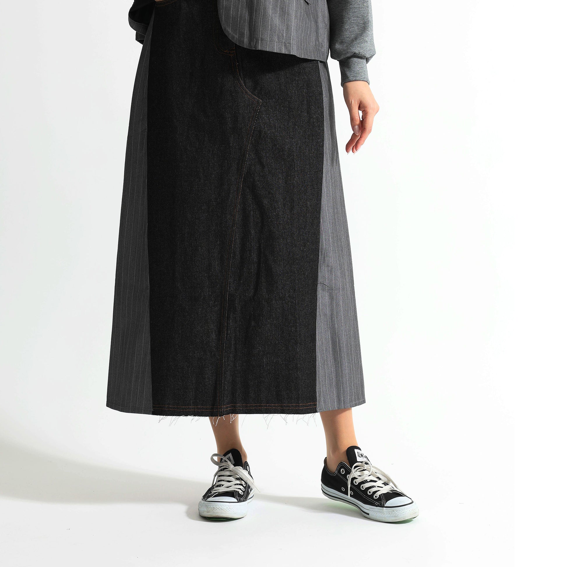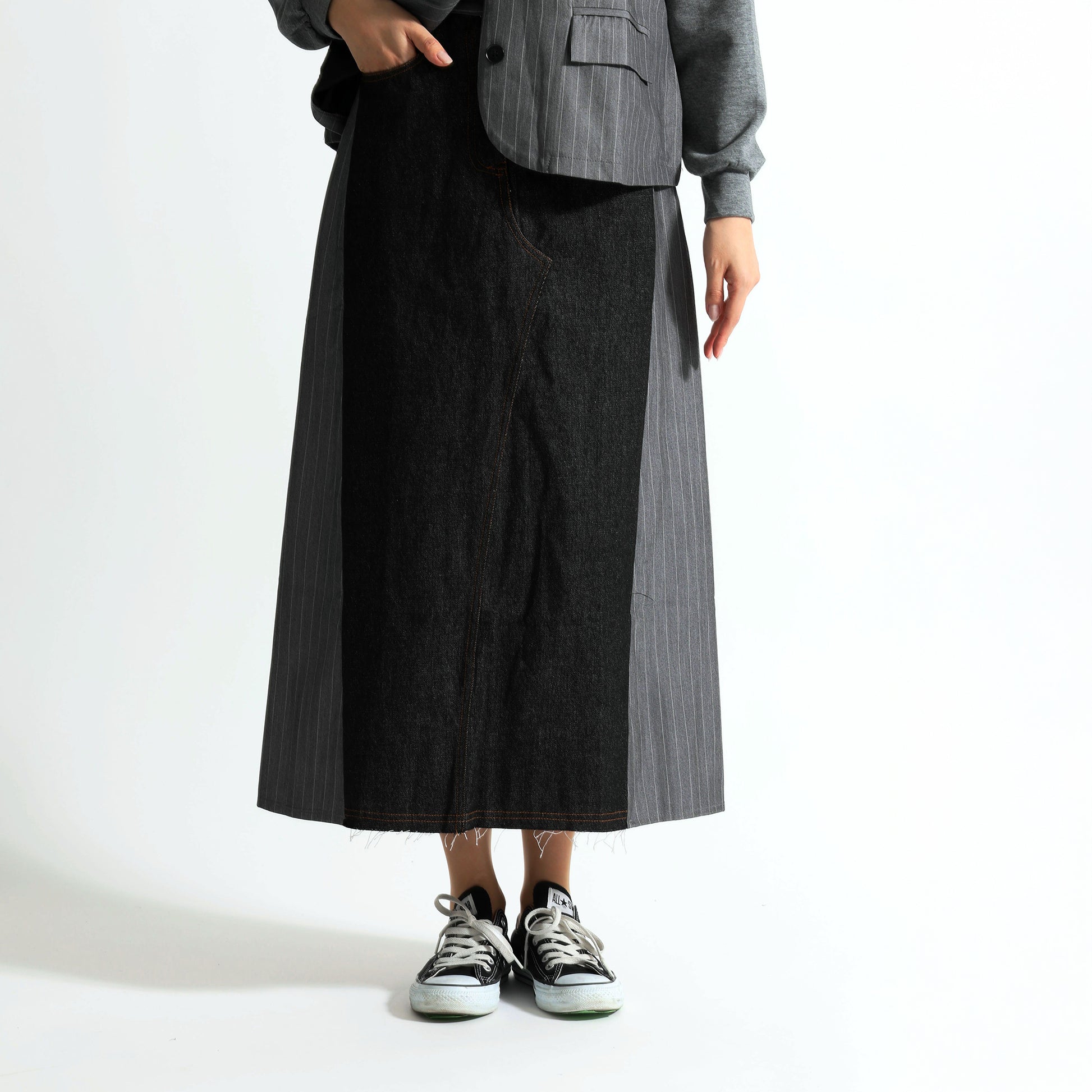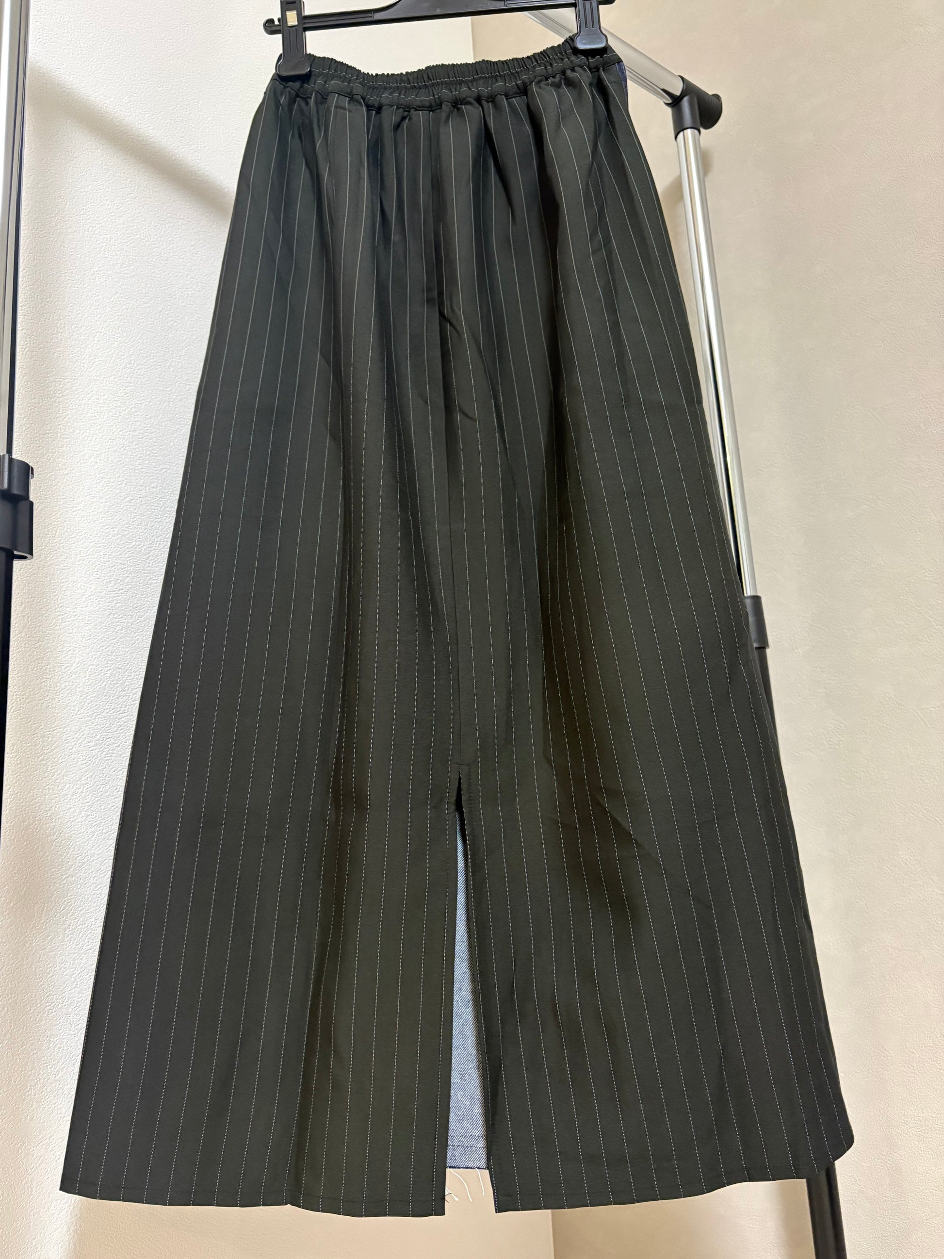 ピンストライプ切り替え 再構築デザイン デニムロングスカート