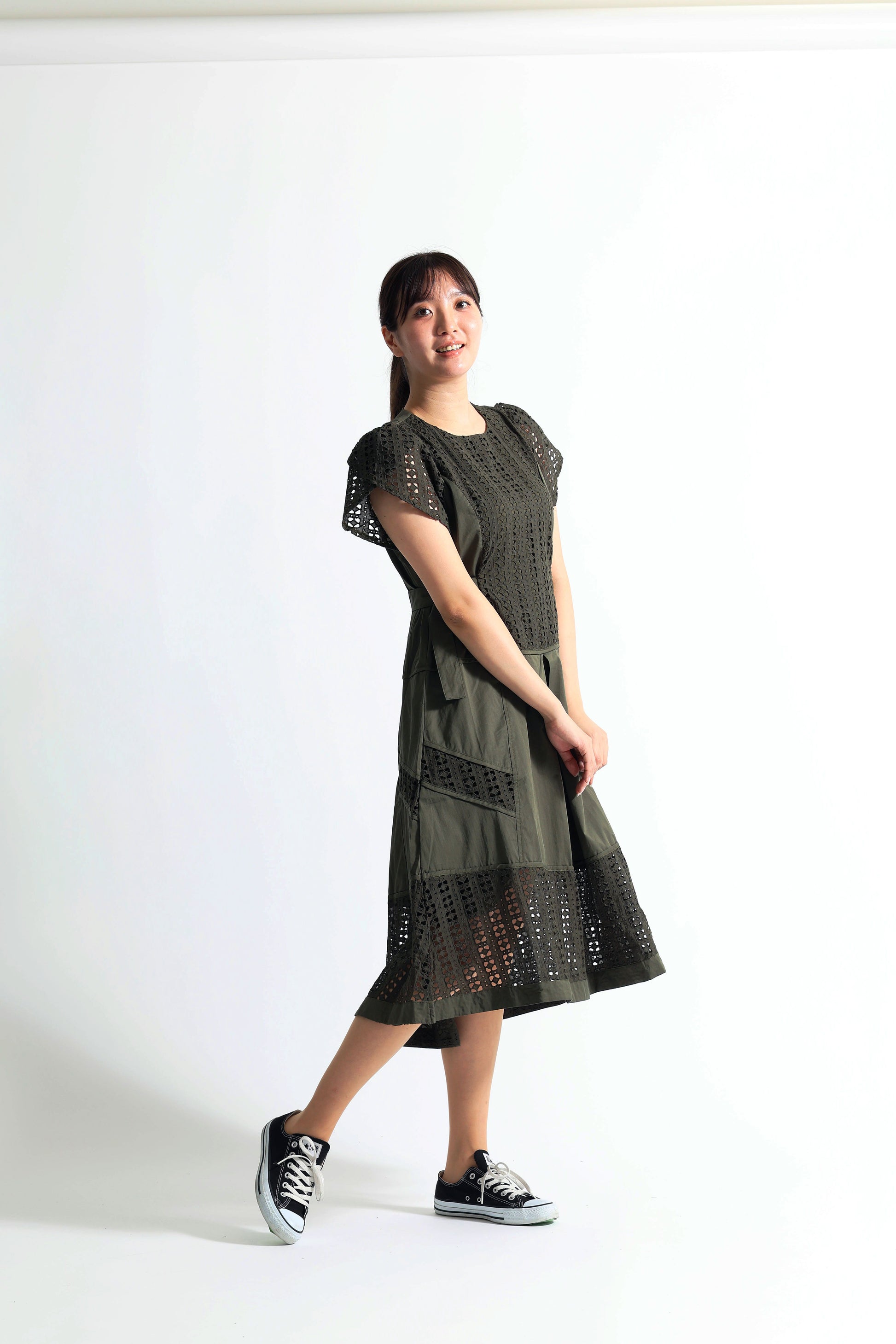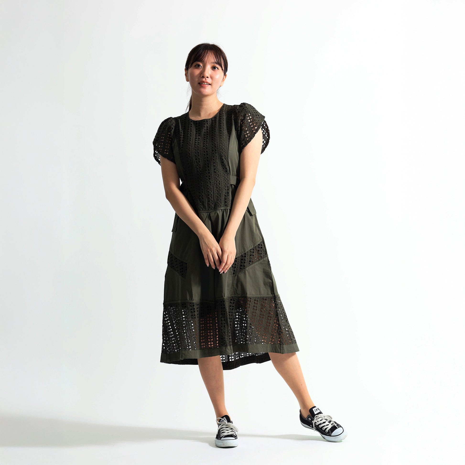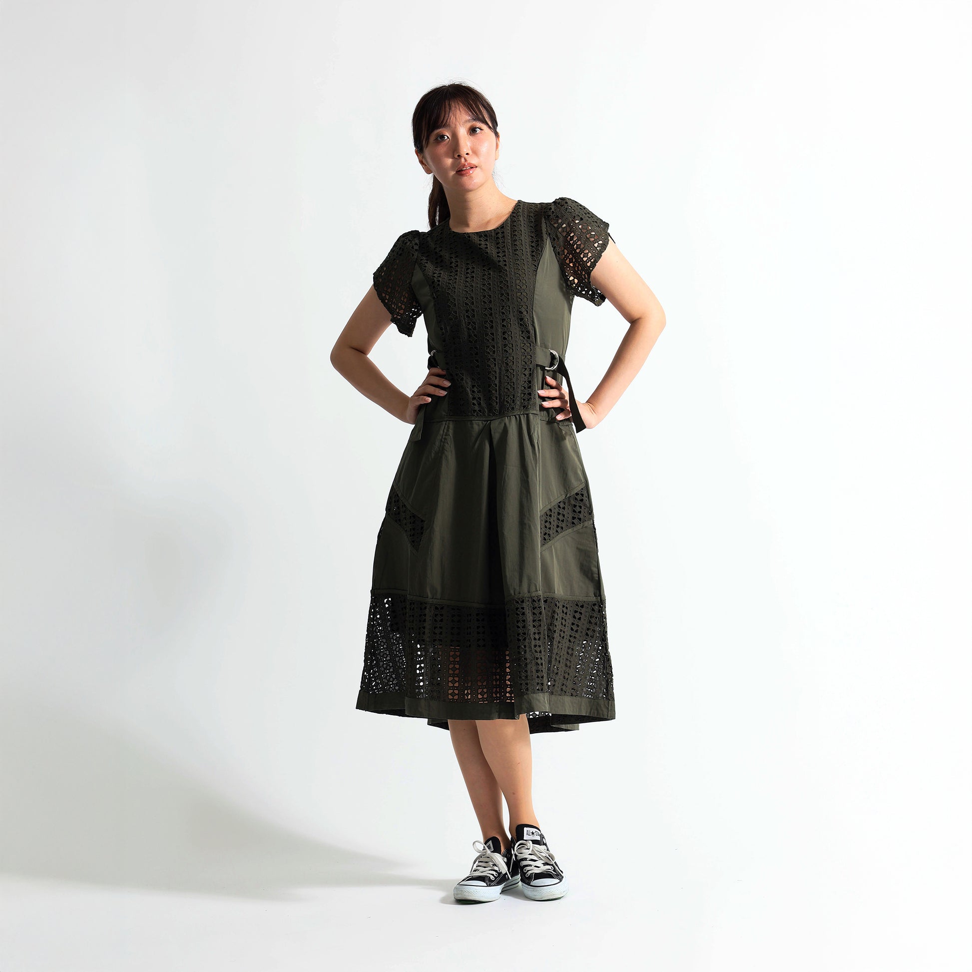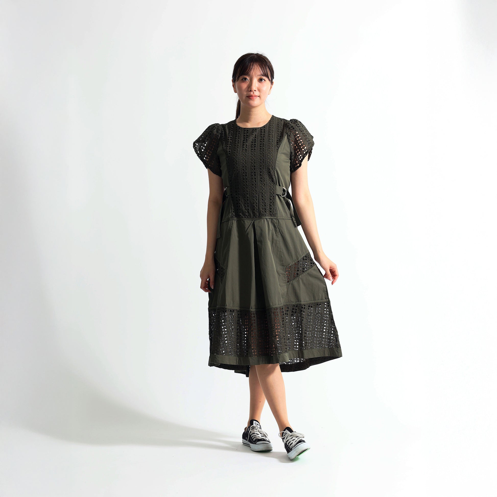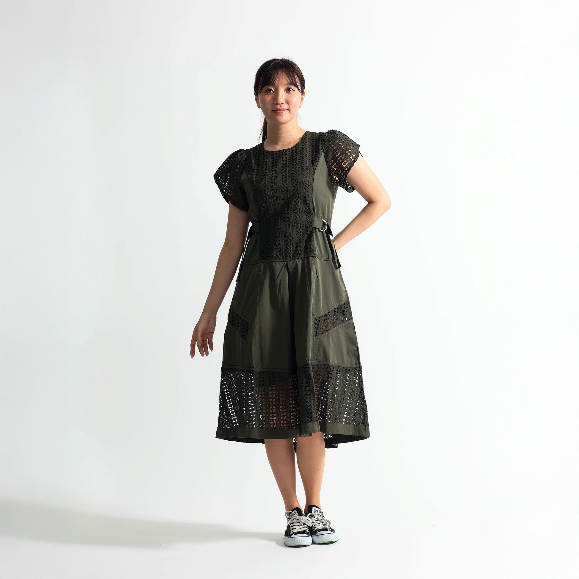 [1枚で完成する気品]幾何学カットワークレース切替 サイドベルト付 ロングワンピース