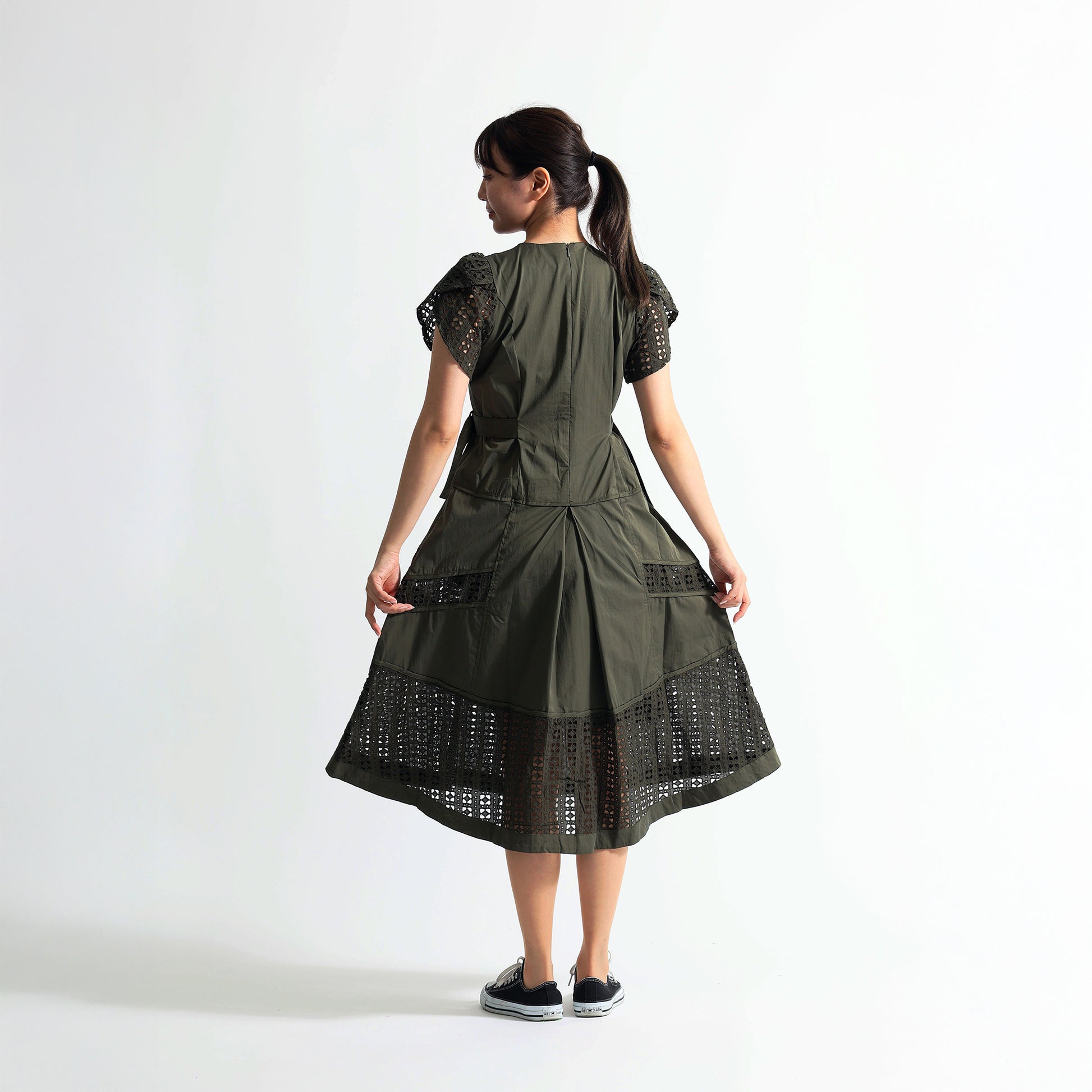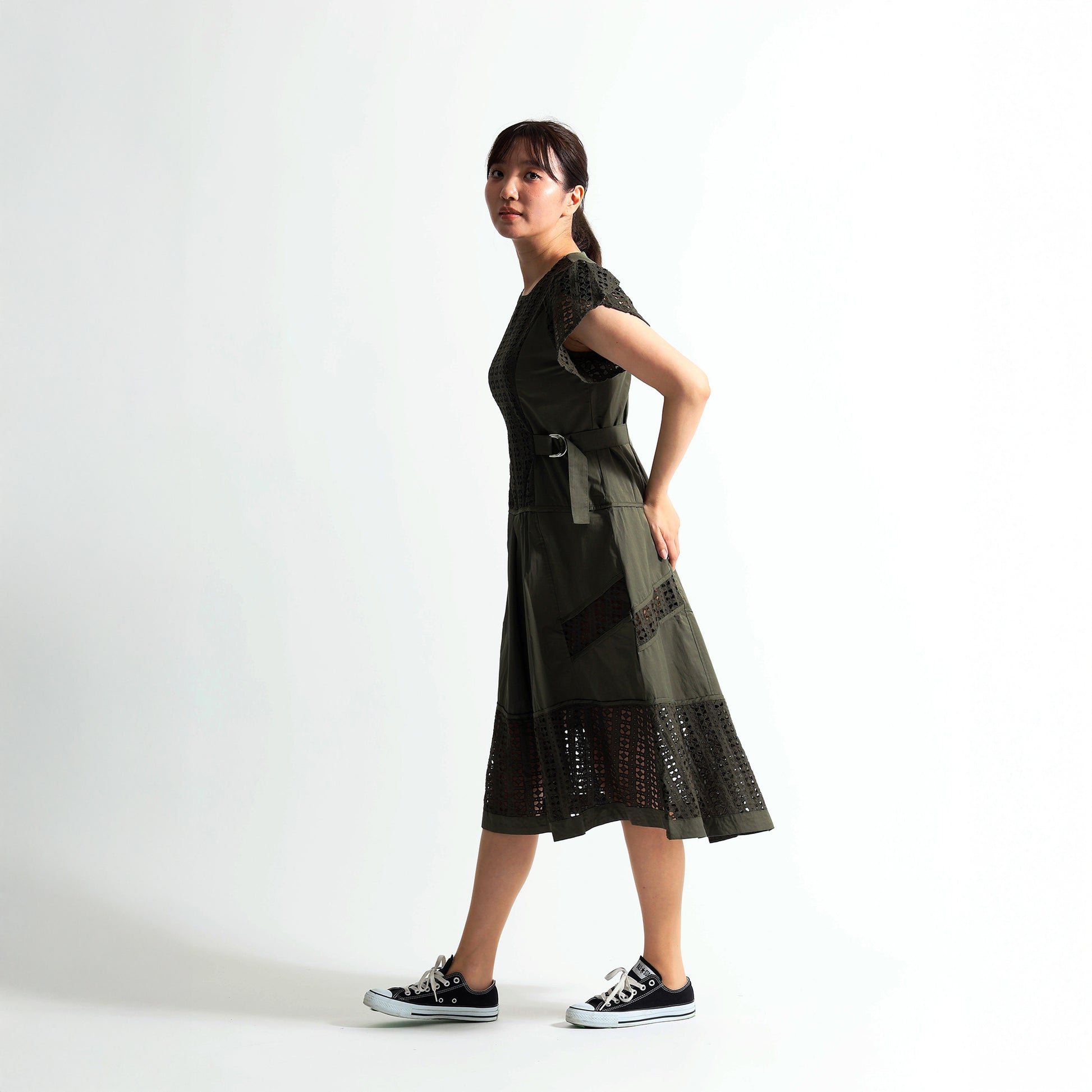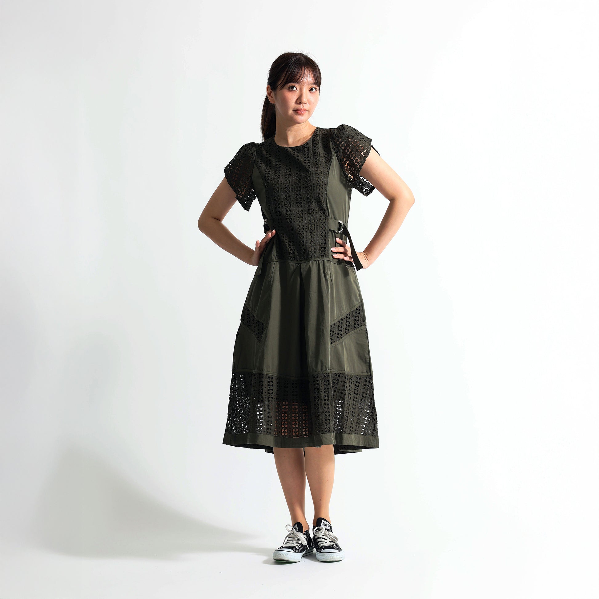 ダブルサイドベルトデザイン:ウエストの両サイドにあしらわれたDカンベルトを取り組むことで、フィット&フレアの美しいシルエットが完成します。スタイルアップ効果も抜群です。